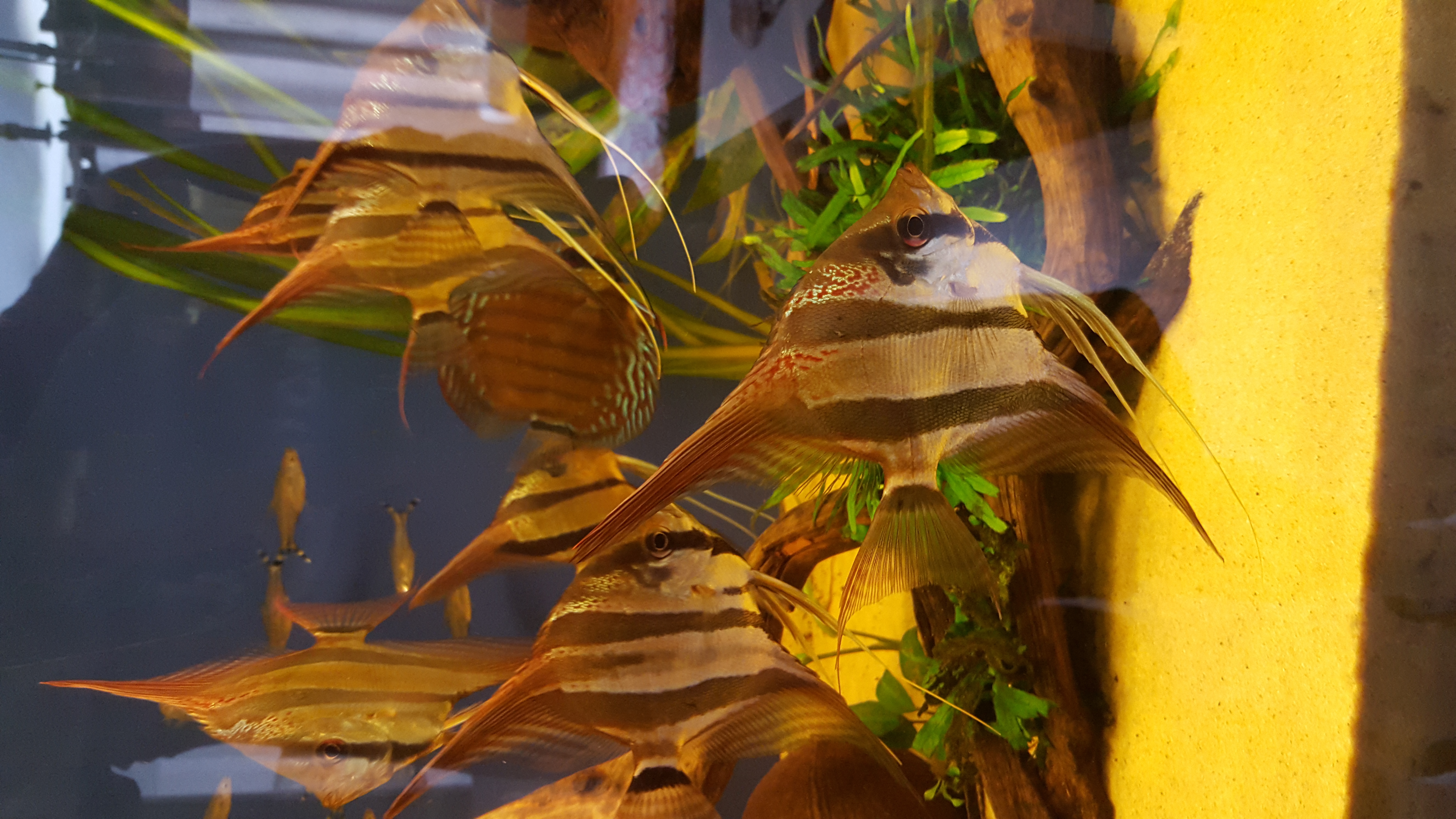 o fotkach już pisałem jak się nie ma sprzętu to się nie robi i tyle do tego ciemnia w mojej piwnicy jest tak że jak coś mi na ziemie spadnie to prędzej to rozdepcze niż znajdę do tego w akwarium woda jest tak mocno herbaciana że ryb nie widać do tego ryby płochliwa jak nie wiem co to jak ja mam jakieś sensowne zdjęcia porobić jak ja sam ryb prawie nie widzę,młode już mają światło więc jutro coś postaram sie pstryknąć jak to teraz wygląda.